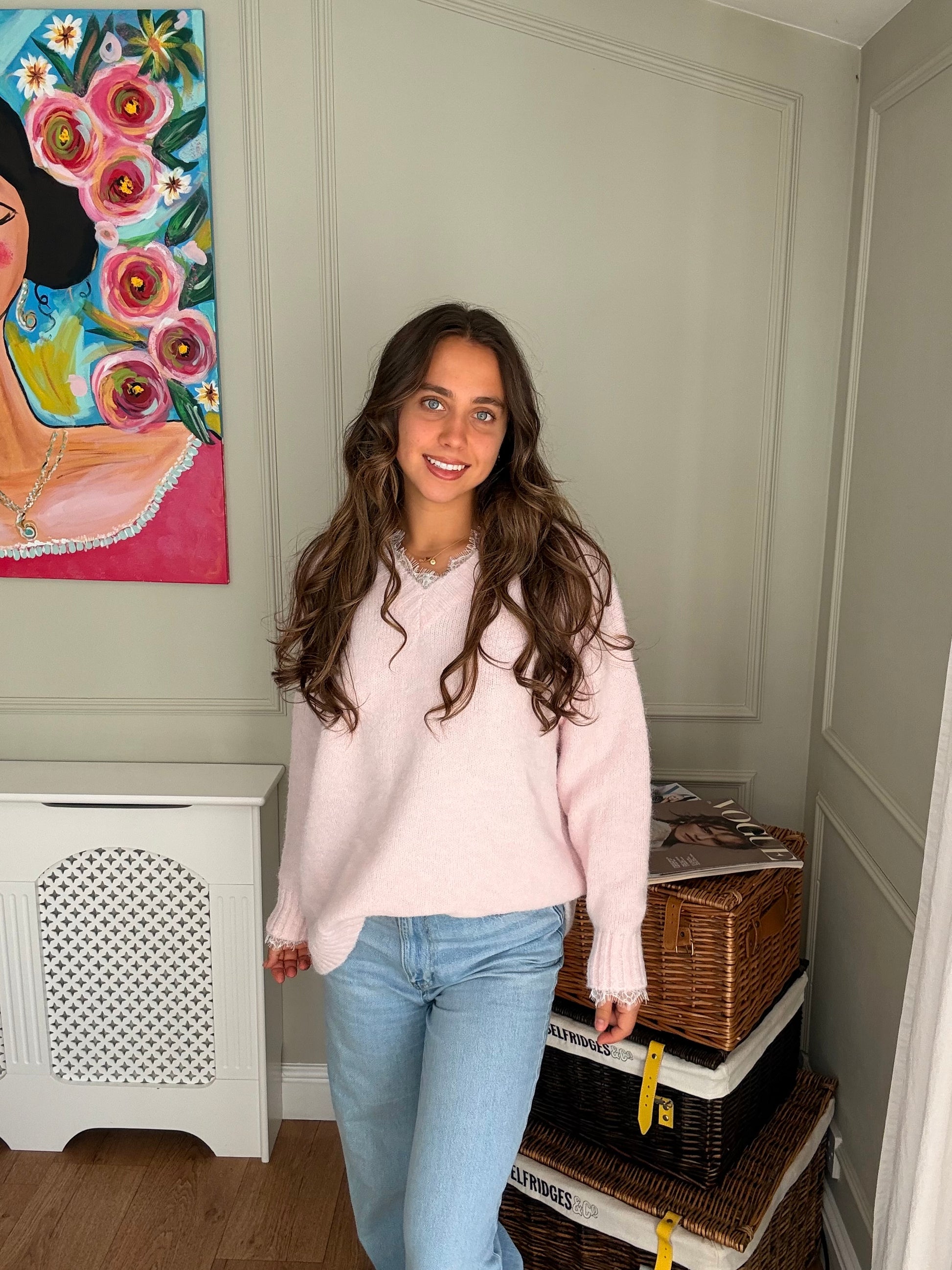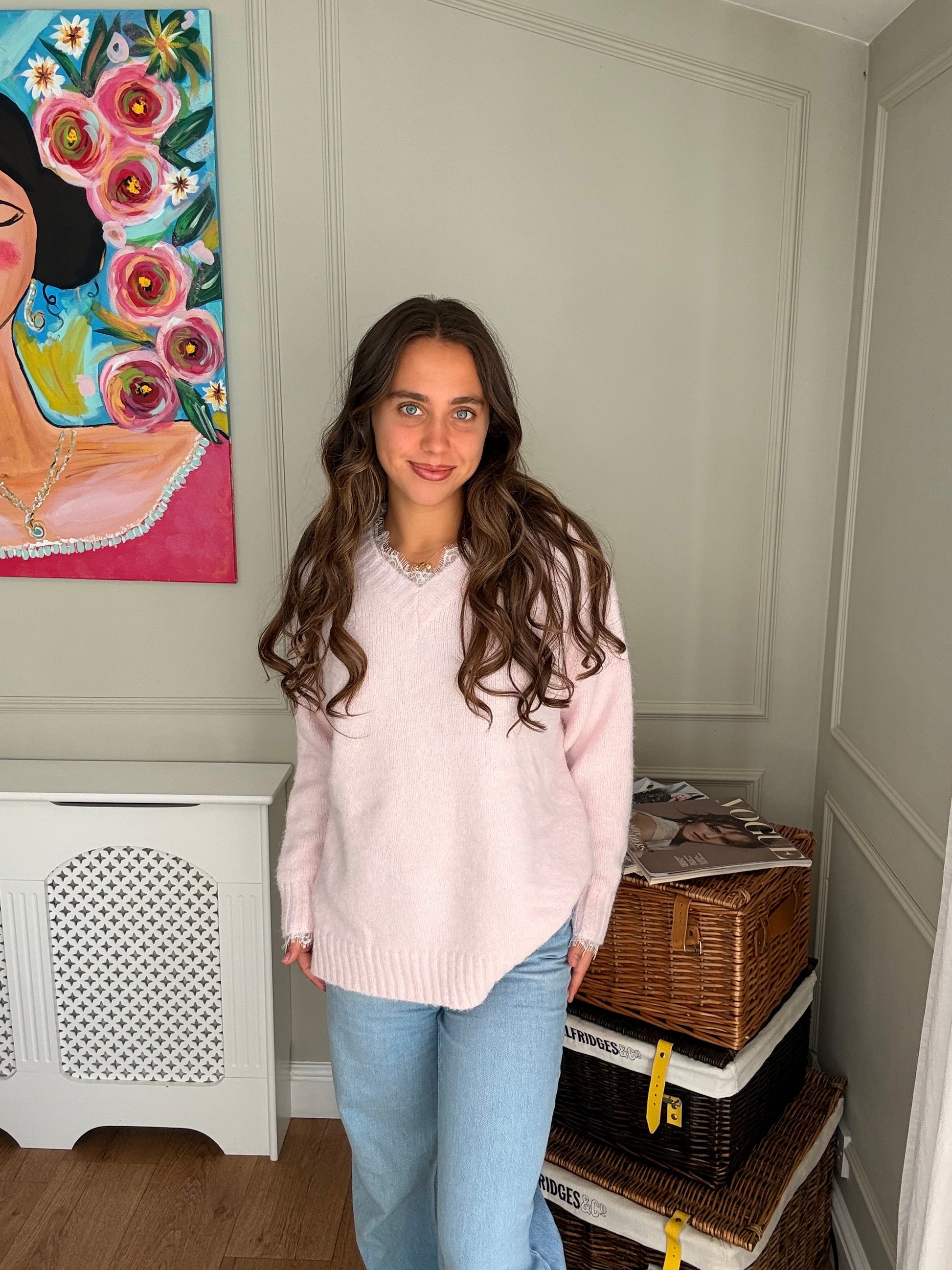 This gorgeous Pink V-Neck Lace Jumper is super soft and features delicate lace detailing at the neckline, adding an elegant and unique touch. Perfect for dressing up or keeping cozy in style, this jumper blends comfort with a feminine flair, making it a standout piece in any wardrobe.