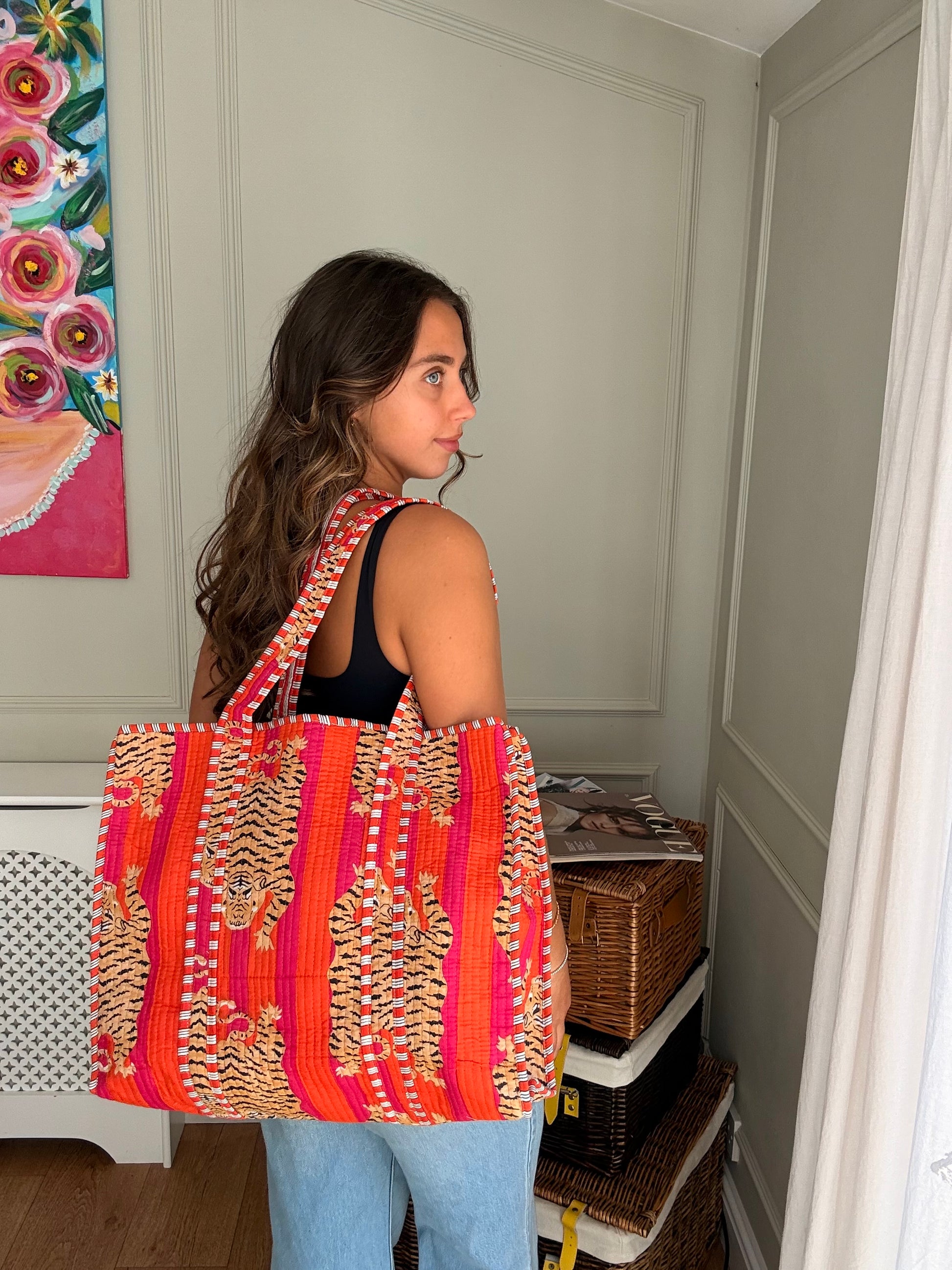 Our new quilted tote bags are crafted from 100% soft cotton and feature a fully lined interior with a contrasting fabric, complete with a pocket inside. They’re just the right size for a weekend getaway or a day at the beach! Available in a variety of stunning colours and prints to match your style.